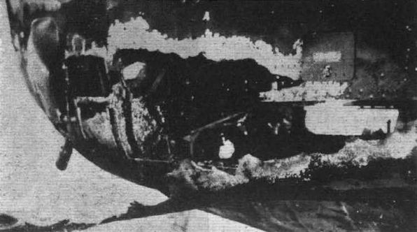The burnt-out rear lower gun turret and bomb bay of the Handley Page Hampden on which Sgt. Hannah was flying when he earned the V.C.