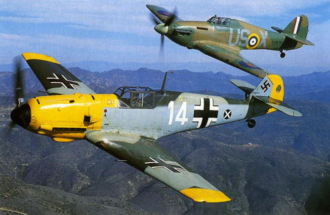 Three specially prepared photographs from identical viewpoints and approximately to scale of the German Messerschmitt Me 109 (top), the Supermarine Spitfire, and the Hawker Hurricane. It will be noted that the British machines are larger but considerably cleaner.