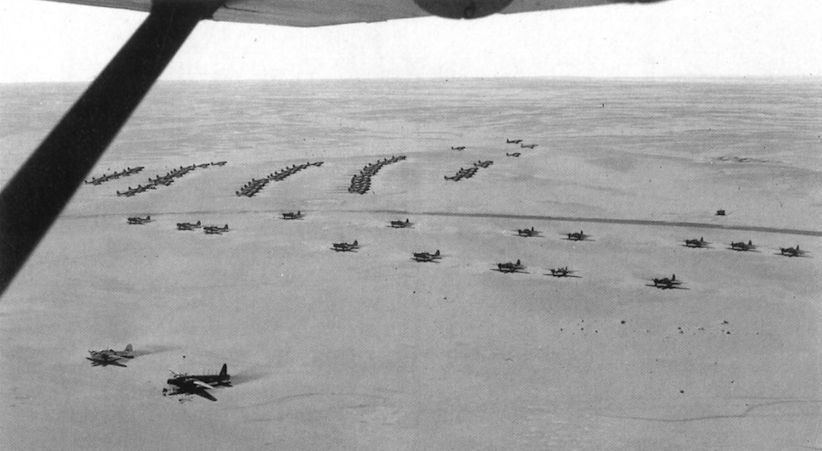 An unusual aerial study of “Kilo 40”, alias LG237/Gebel Hamzi, north-west of Cairo, taken on March 22, 1944. Apart fom the lone ASV radar-equipped “stickleback” Vickers Wellington in the foreground and two more of its kind in the far distance, all of the other aeroplanes in view are Martin Marylands.