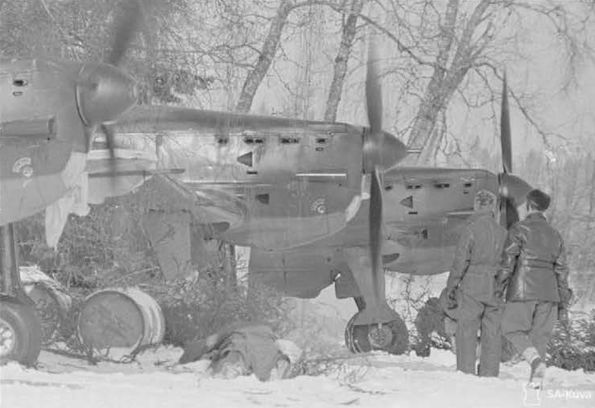 Финские механики проверяют работу двигателей французских истребители MS.406C-1. Самолёты установлены на козлы (внизу).