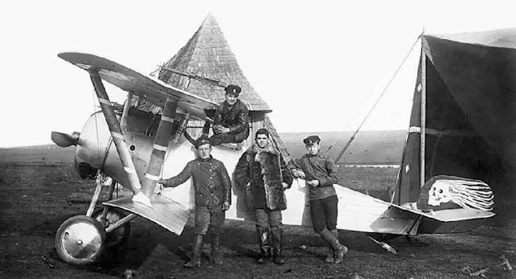 Летчики УГА перед боевым вылетом. На заднем плане - "Ньюпор-21" с украинскими опознавательными знаками: желтый (внутренний) и голубой (внешний) круги на крыльях, желто-голубой киль