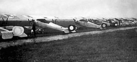 Линейка самолетов 1-й Советской боевой авиагруппы на аэродроме у станции Свияжск, сентябрь 1918г.