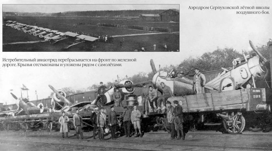 Истребители "Ньюпор" и "СПАД" из состава авиагруппы Московской авиашколы, 1919г. Хорошо видно, что у части самолетов ещё присутствуют опознавательные знаки авиации царской армии.