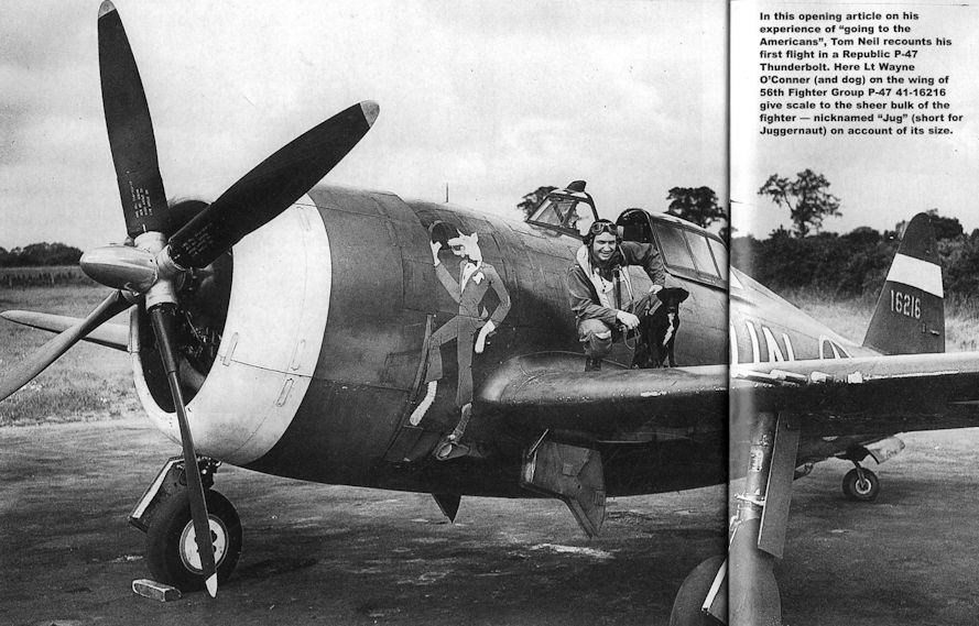 In this opening article on his experience of “going to the Americans”, Tom Neil recounts his first flight in a Republic P-47 Thunderbolt. Here Lt Wayne O’Conner (and dog) on the wing of 56th Fighter Group P-47 41-16216 give scale to the sheer bulk of the fighter - nicknamed “Jug” (short for Juggernaut) on account of its size.
