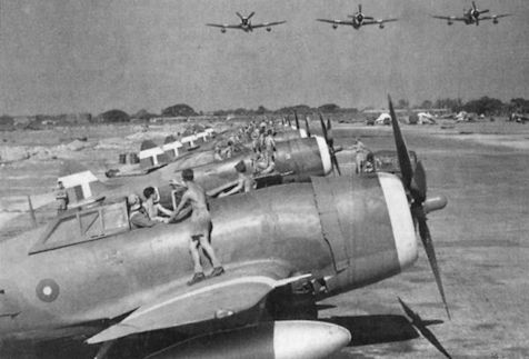 Когда во второй половине 1944 года Thunderbolt Mk I прибыли на Дальний Восток, они заменили Hurricane в качестве истребителя-бомбардировщика. Эти Thunderbolt Mk I с ПТБ сфотографированы на фоне эскадрильи Hurricane.