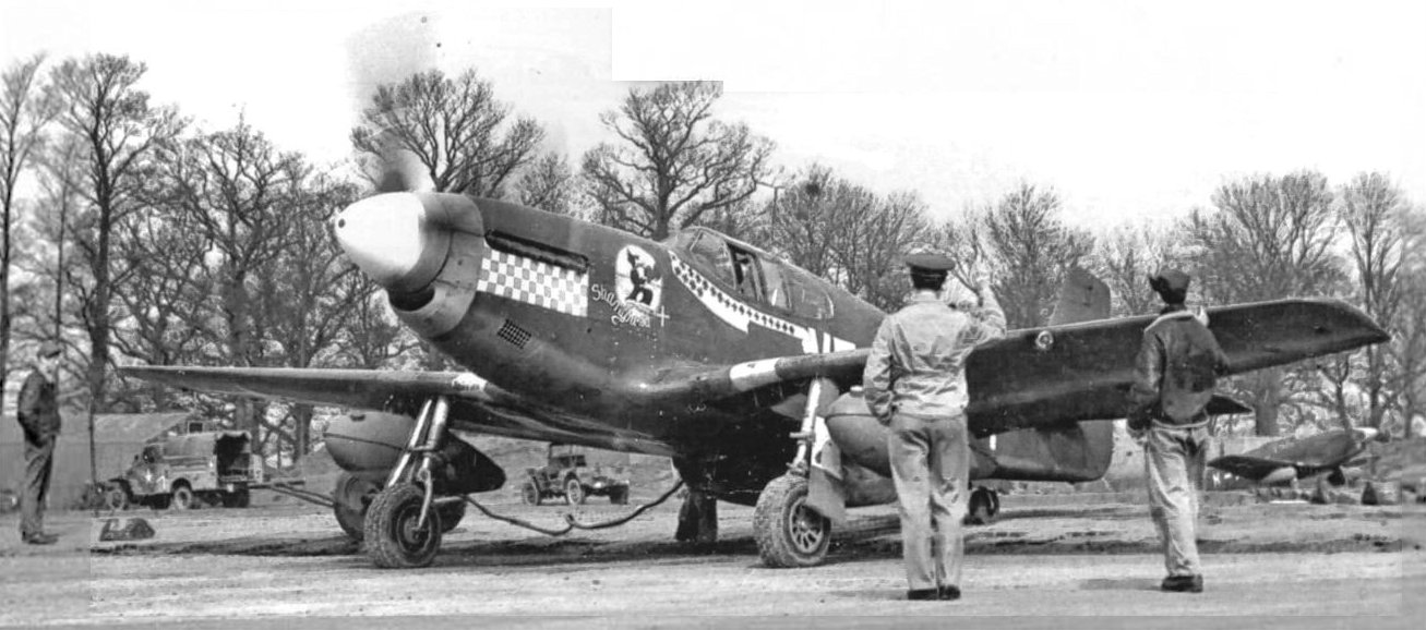 P-51B-5NA Mustang. На этом самолете в апреле 1944 года летал 1-й лейтенант Николас Мегура из 344-й эскадрильи 4-й истребительной группы. Мегура прибыл в Великобританию в числе первых пилотов Mustang, В воздушных боях ему засчитали 11,83 победы, и еще 3,75 самолета он уничтожил на земле. В мае 1944 года Мегура был ошибочно атакован своим P-38 и произвел вынужденную посадку в Швеции.