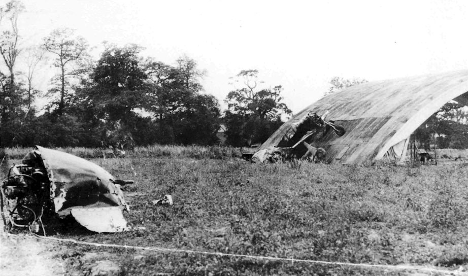 Регистрационный номер: AG385 What had started as a perfectly normal landing went sadly astray as Mustang AG385 of No.41 OTU swung on landing and attempted to demolish one of Poulton's blister hangars on 14 August 1943, leaving the pilot in his cockpit but short of wings, engine and most of the tail.