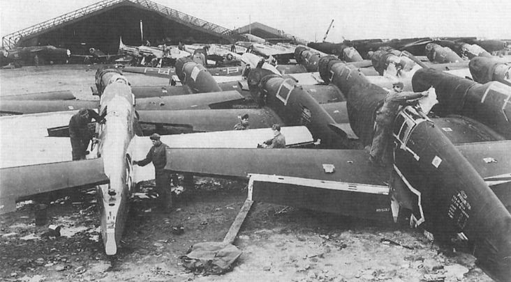 Fresh horses. Newly-arrived high-backed P-51 Mustangs at an assembly plant in Britain in early summer 1944. The aircraft are still swathed in the grease and special wrappings which protected them while they crossed the Atlantic as deck cargo.