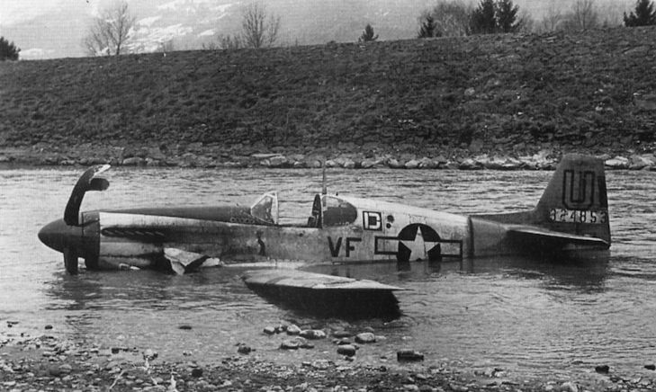 P-51 Mustang 43-24853 Little Ambassador of 52 FG, 15th Air Force, was damaged, over Germany on February 22, 1945, and with the engine out of oil belly-landed on a sandbank in the River Rhine at Rheintal. It was salvaged and taken to Dubendorf where it was scrapped after the war.