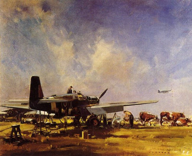 North American Mustangs of 170 Sqn undergoing maintenance at Fresnoy-Folny, just north of Dieppe, in 1944. This was painted in one sitting, the artist being sustained by a litre of rough cider given to him by the farmer.