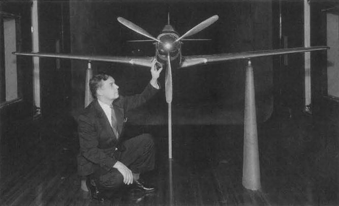 Larry Waite, NAA engineering technical supervisor, checks out the installation of a P-51B model in the throat of the NAA wind tunnel. Wind was provided courtesy of a 3,000 h.p. motor driving a seven-bladed, 19ft propeller at a maximum of 700 r.p.m. - generating an airflow of 325 m.p.h. over the model.