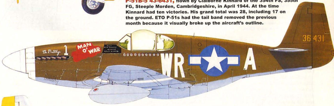P-51B-5 43-6431, flown by Claiborne Kinnard of the 354th FS, 355th FG, Steeple Morden, Cambridgeshire, in April 1944. At the time Kinnard had ten victories. His grand total was 28, including 17 on 1 the ground. ETO P-51s had the tail band removed the previous month because it visually broke up the aircraft’s outline.