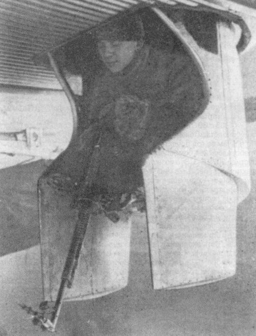 Вид сзади на подкрыльевую стрелковую башню Б-2 в выдвинутом положении. Хорошо виден пулемет ДА калибра 7,62 мм., а также балочные держатели Дер-13, рассчитанные на 250-кг бомбы.