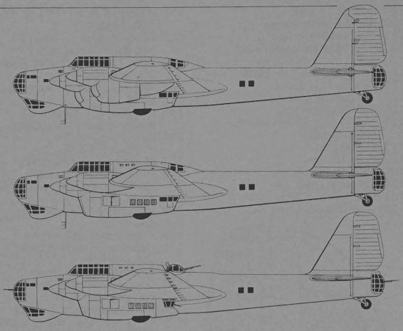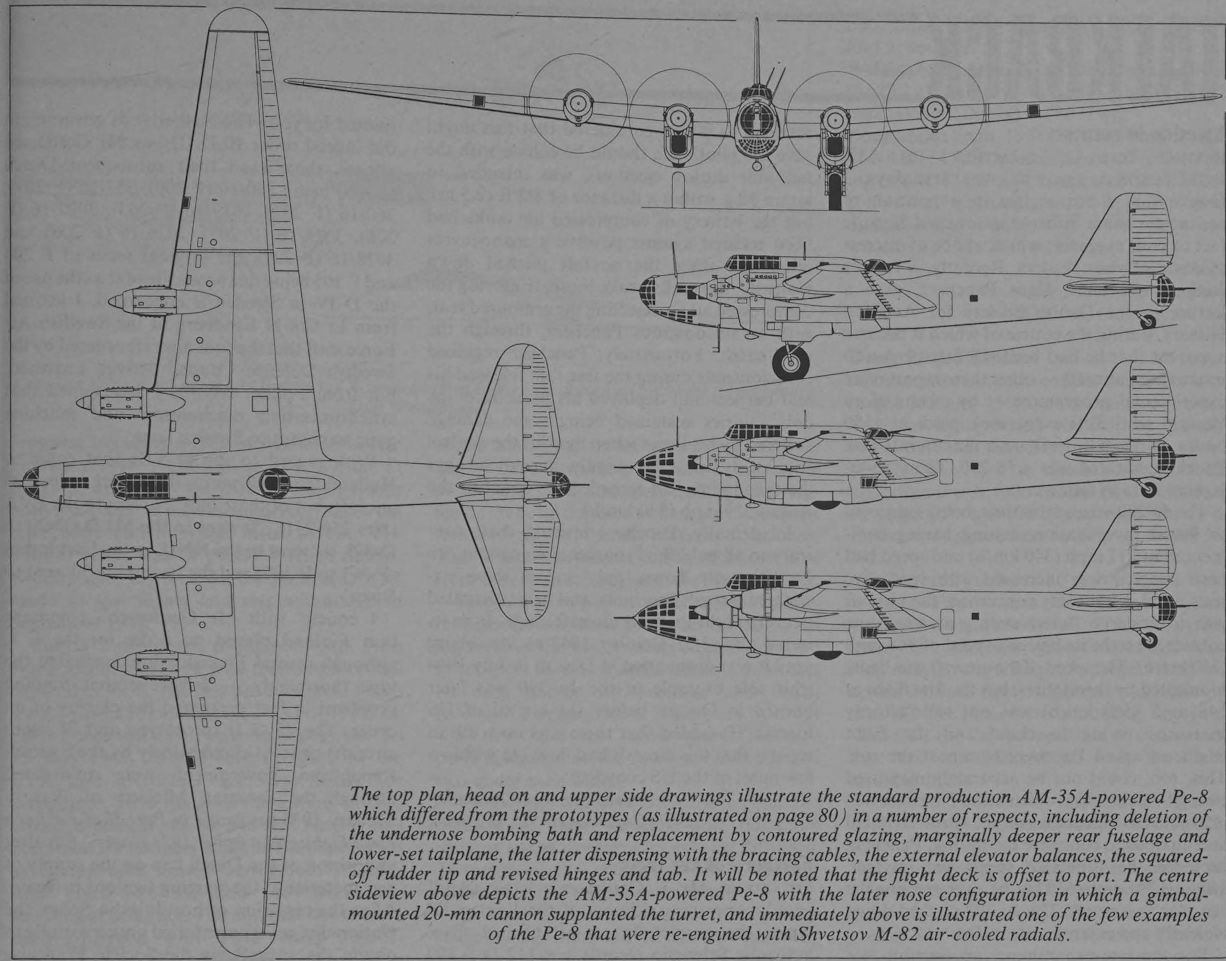 The top plan, head on and upper side drawings illustrate the standard production AM-35A-powered Pe-8 which differed from the prototypes in a number of respects, including deletion of the undernose bombing bath and replacement by contoured glazing, marginally deeper rear fuselage and lower-set tailplane, the latter dispensing with the bracing cables, the external elevator balances, the squared-off rudder tip and revised hinges and tab. It will be noted that the flight deck is offset to port. The centre sideview depicts the AM-35A-powered Pe-8 with the later nose configuration in which a gimbal-mounted 20-mm cannon supplanted the turret, and immediately above is illustrated one of the few examples of the Pe-8 that were re-engined with Shvetsov M-82 air-cooled radials.