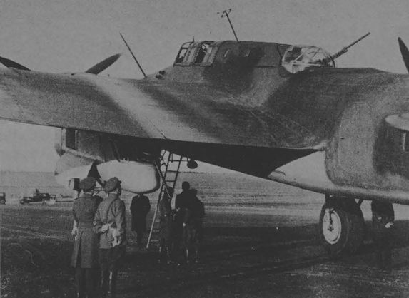 Вид на носовую часть ТБ-№742015. Фото сделано во время испытаний весной 1941 года. Видна носовая башня НЭБ-42 с пулеметами ШКАС и остекление кабины штурмана