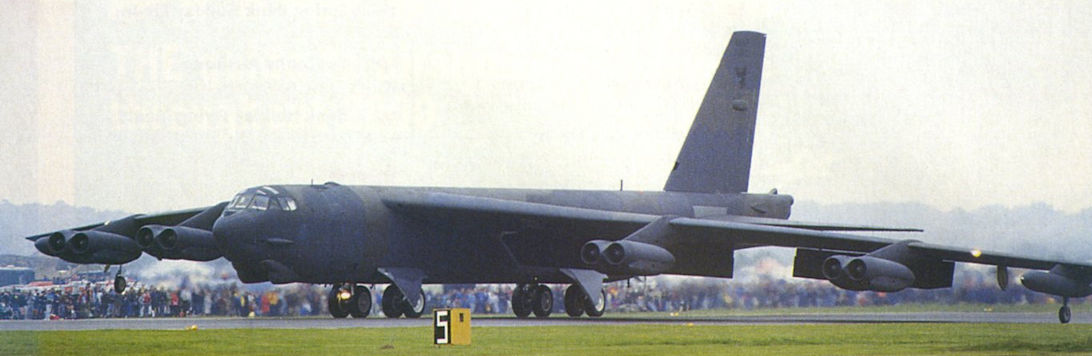 Тяжело нагруженный B-52G взлетает с британской авиабазы Фэйрфорд в рамках операции по нанесению круглосуточных ударов по силам иракской Республиканской гвардии во время войны в Персидском заливе (1991 год). B-52 совершили 1624 боевых вылета, сбросив 25 700 тонн бомб (29% от всей массы авиационных боеприпасов, использованных в ходе той войны).