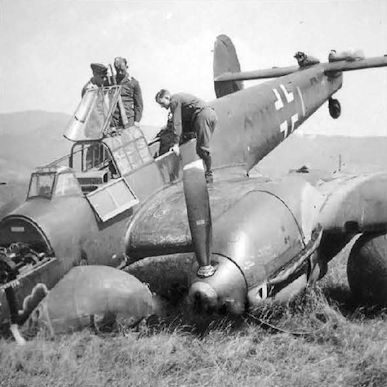 Снимок сделан во Франции летом 1940 года. Самолет из 1./ZG 52 либо "встал на нос" при взлете с полевого аэродрома или едва не скапотировал при посадке.