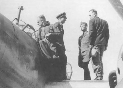 A Scottish captain examining Rudolf Hess’s machine after it crashed at Bonnyton Moor, south of Glasgow, on May 10, 1941. The groove carrying the release cable for the dinghy may be clearly seen along the top of the fuselage, with the cable itself hanging from the rear. At this time, the extended fuselage carrying the dinghy was a modification made only on variants of the Bf 110E. -