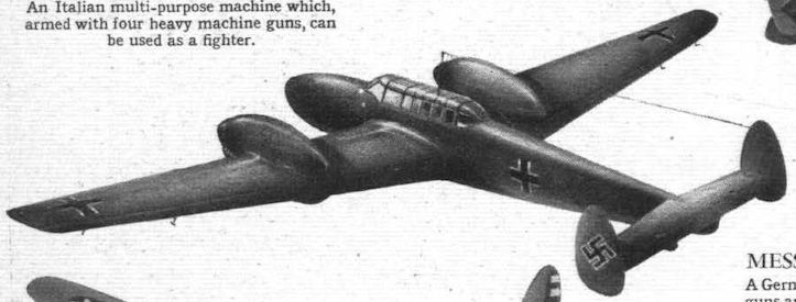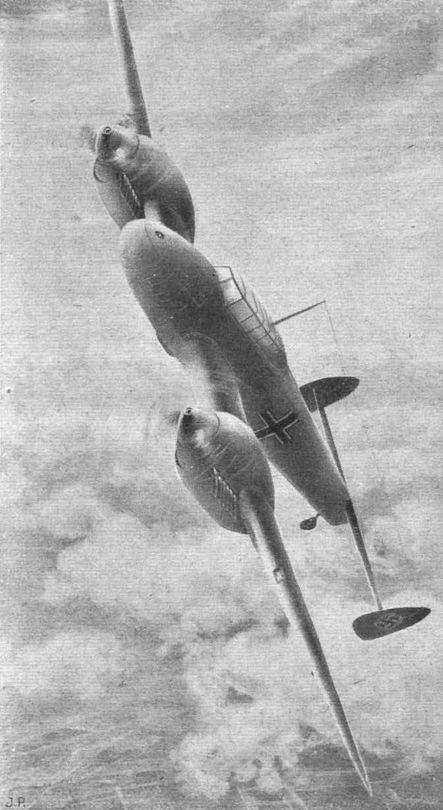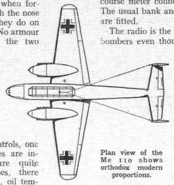 Messerschmitt Me 110 twin-engined fighter and multi-purpose machine with Daimler-Benz DB 601 engines were used in the action last week when seven Wellingtons were brought down and twelve Messerschmitts suffered the same fate. The Me 110 which mounts shell-firing guns is shown above. The Germans say it is faster than our Spitfires, but this is doubtful.