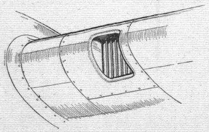 The air intake leading to the supercharger of the port engine is in the leading edge of the wing and has guide vanes to reduce frictional losses.