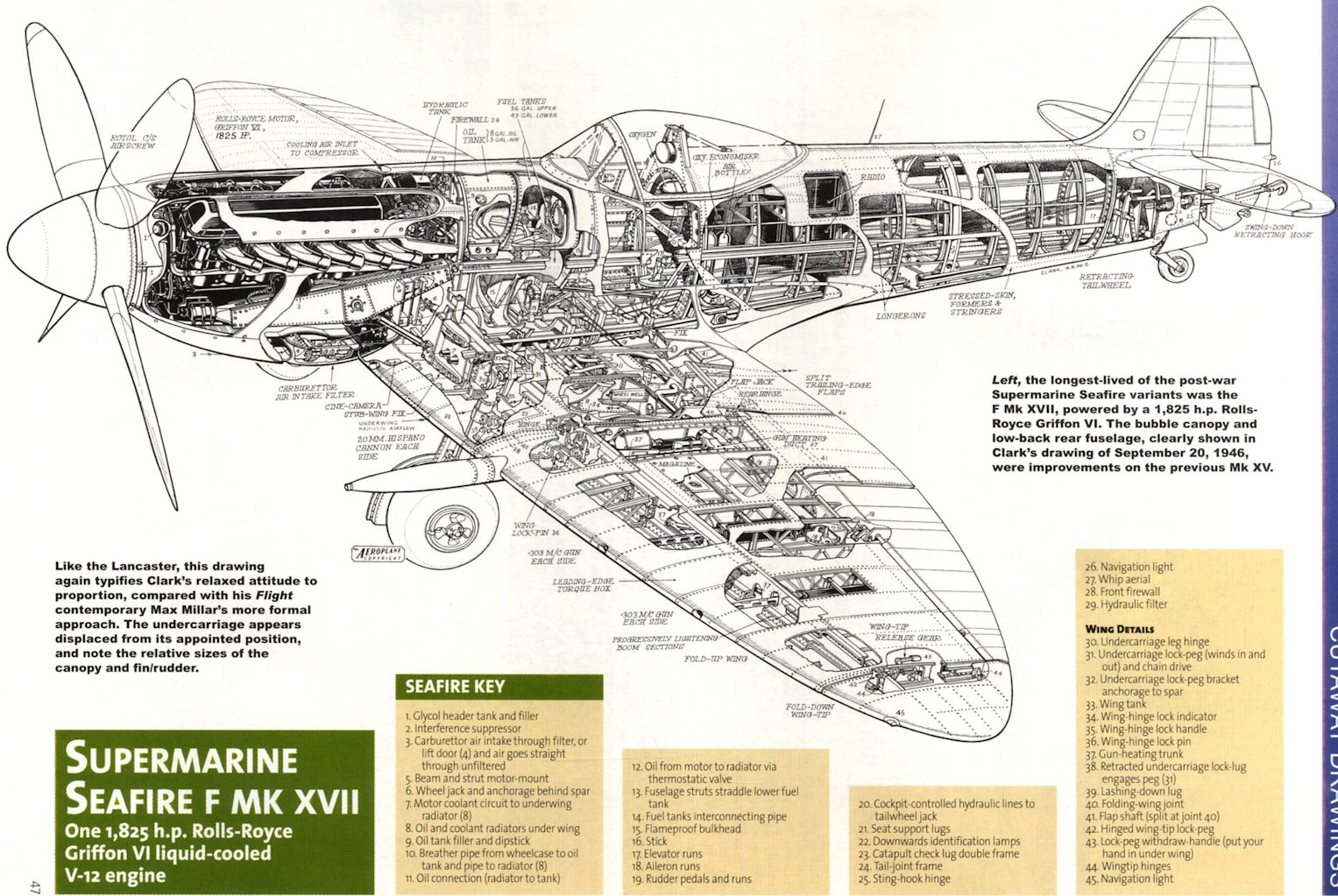 The longest-lived of the post-war Supermarine Seafire variants was the F Mk XVII, powered by a 1,825 h.p. Rolls-Royce Griffon VI. The bubble canopy and low-back rear fuselage, clearly shown in Clark's drawing of September 20, 1946, were improvements on the previous Mk XV.
