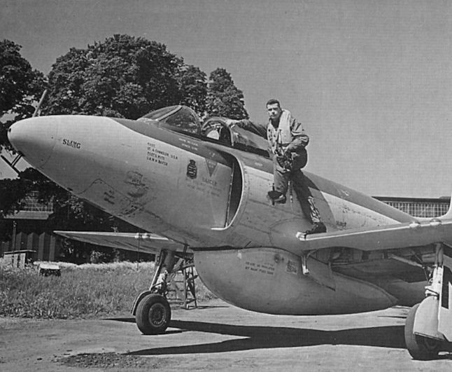 Lt Chandler of the USN poses atop a Supermarine Attacker. The aircraft is festooned in stencilling highlighting positions for slings and ballast in addition to warning people to KEEP AWAY FROM INTAKES WHILE ENGINE IS RUNNING and so on.