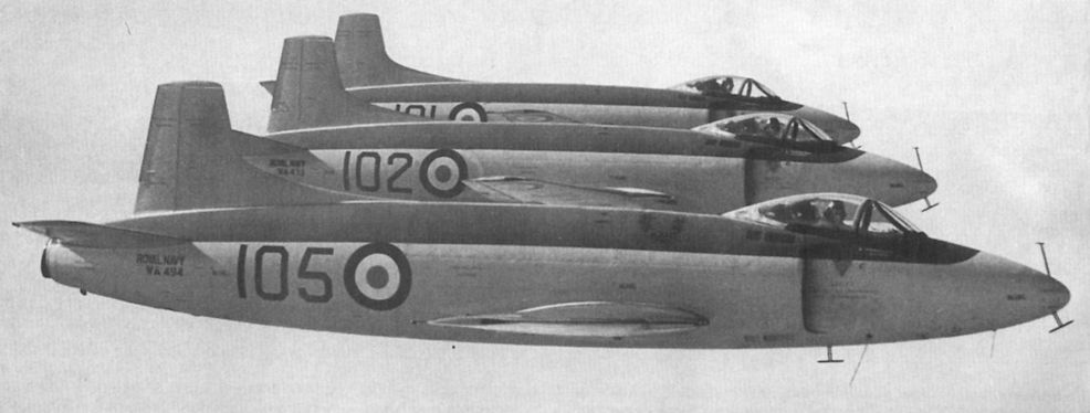 Регистрационный номер: WA473 [3], WA494 [3] Three Attacker F.1s of 800 Sqn FAA in echelon. Nearest is WA494, with WA473 behind. The latter is now the sole surviving example of the breed, preserved by the Fleet Air Arm Museum at Yeovilton.