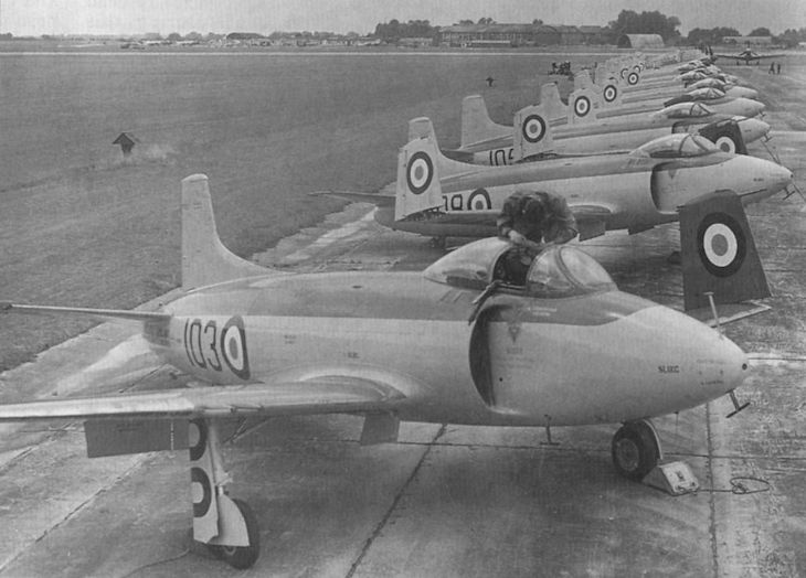 The newly delivered Attackers of 800 Sqn, the Royal Navy’s first operational jet squadron, lined up in dispersal during a display at RNAS Ford (HMS Peregrine) in Sussex on September 8, 1951.