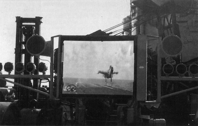 The batsman was rendered obsolete by the mirror landing sight. Here, a de Havilland Sea Venom FAW.22 of 891 Sqn is reflected in the mirror of HMS Ark Royal in the mid-1950s.