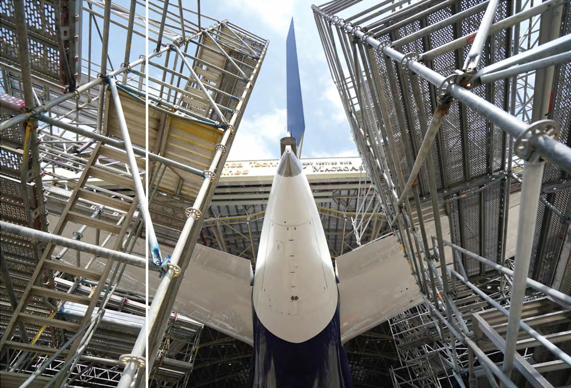 Wind tunnel testing was carried out at a number of facilities. A 1/32nd scale model, with its flaps deflected, is seen here undergoing low-speed testing in a Daimler Benz Aerospace wind-tunnel at Bremen.