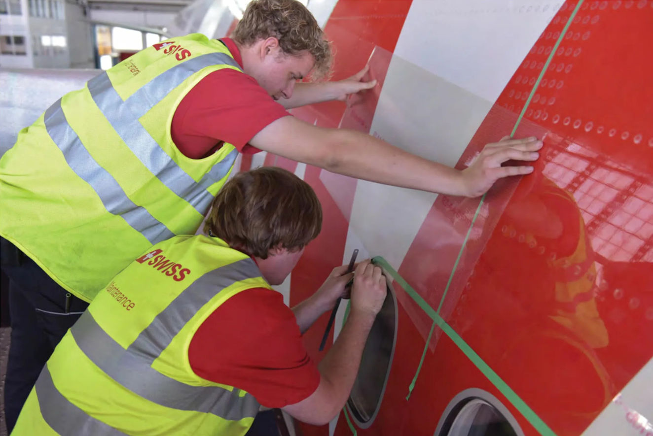 Фигура техника дает наглядное представление о размере вентилятора и гондолы двигателя Trent 800. На фотографии: самолет Boeing 777 авиакомпании "Singapore Airlines", хорошо видны серповидные лопасти вентилятора.