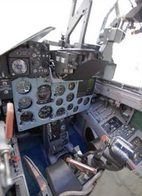 Left: Front cockpit of the L-139 incorporating Western avionics, including a HUD and multi-function displays. Right: Rear cockpit layout of the L-139. The prominent unit, mounted high on the instrument panel, is a TV repeater of the front cockpit HUD display.
