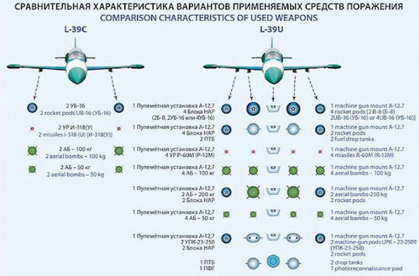 L-39ZO: учебный самолет с вооружением; первый полет совершил 25 августа 1975 года; имел усиленное крыло с четырьмя подкрыльевыми подвесками для вооружения; был одноместным, заднее кресло убиралось, вместо него устанавливался дополнительный топливный бак