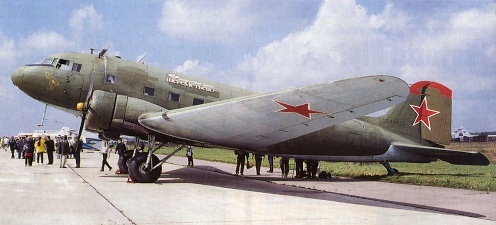 A V-VS Li-2 (circa 1944) in dark green and olive camouflage with white undersurfaces.