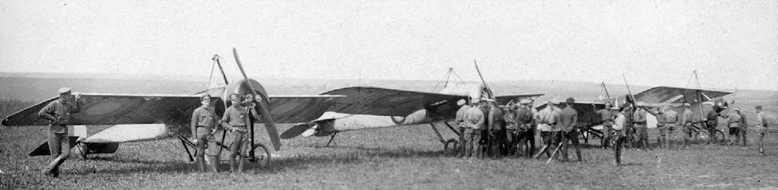 «Моран-Солнье G» из состава авиагруппы Гатчинской Офицерской Школы Авиации Отдела воздушного флота (ОВФ). Под крылом укреплен вымпел ОВФ. Опознавательные знаки (в традиционном понимании этого термина) ещё отсутствуют.