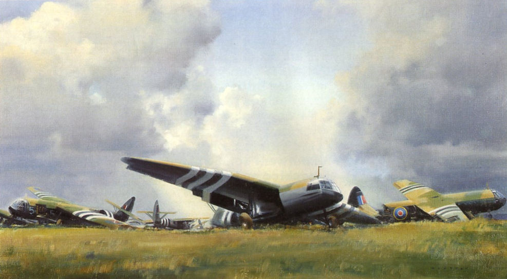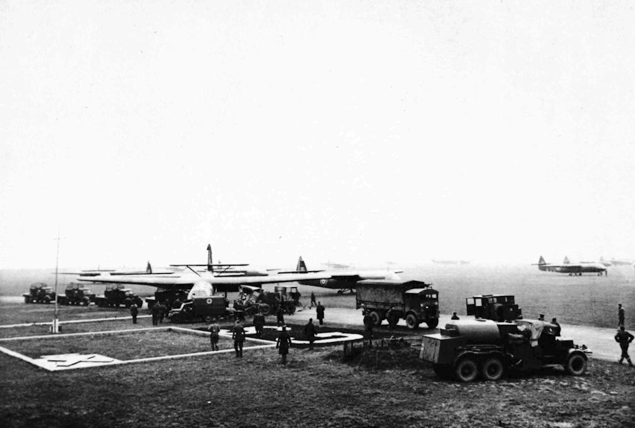Десантные планеры Airspeed Horsa и General Aircraft Hamilcar перед вторжением на континент были сосредоточены на британской авиабазе Тарант-Раштон, графство Дорсет. Также видны самолеты Halifax Mk V из 298-й и 644-й эскадрилий - буксировщики данных планеров.