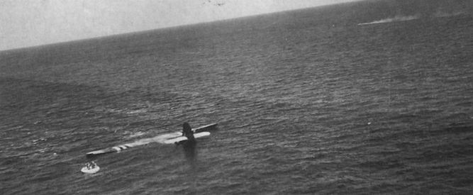 A ditched Horsa glider 30 miles off Clacton, with its crew in a dinghy which had just been dropped by Mac, CO of 280 Sqn, flying an ASR Warwick on patrol with another ASR Warwick flown by Fg Off Ayres. A High Speed Launch was called up to complete the rescue. This was the only glider to come down in the sea while bound for Arnhem on September 17, 1944. The photograph was taken from a 280 Sqn ASR Warwick.