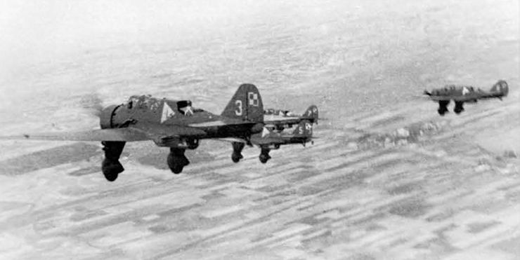 Звено бомбардировщиков PZL-23 «Карась» из 12-го бомбардировочного дивизиона в полёте. Весна-лето 1939 г.