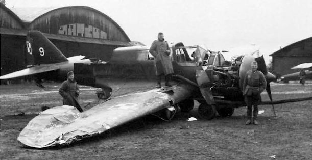 Повреждённый во время боевого вылета 10 сентября 1939 г. PZL-23 «Карась» из состава 42-й развед. эскадры ВВС Польши, доставшийся немцам на аэродроме Люблин. Фото сентября-октября 1939 г.