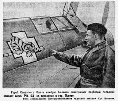 Часть страницы одного из номеров газеты «Красная Звезда» за сентябрь-октябрь 1939 г. Скорее всего этот легкий бомбардировщик PZL-23 «Карась», который осматривает на аэродроме во Львове Герой Советского Союза и участник недавних транс-полярных перелётов комбриг Александр Васильевич Беляков, не подбит, а просто брошен. Отметим, что судя по эмблеме (мультяшный тигр на белом кресте), этот самолет принадлежал 55‑й бомбардировочной эскадре ВВС Польши, в начале войны входившей в состав бомбардировочной авиабригады. Во Львове этот PZL-23, видимо, «застрял» в процессе перегона в Румынию