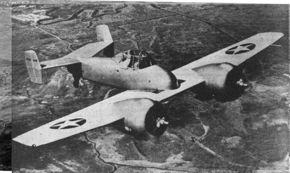 One of three types of American fighter which may conceivably be seen in this country before very long. There is the twin-engined Grumman Skyrocket for which is claimed an extremely high rate of climb. It appears that the fuselage has deliberately been kept short in the nose to permit the close grouping of the engines and airscrews. Armament is carried in the nose of the fuselage.