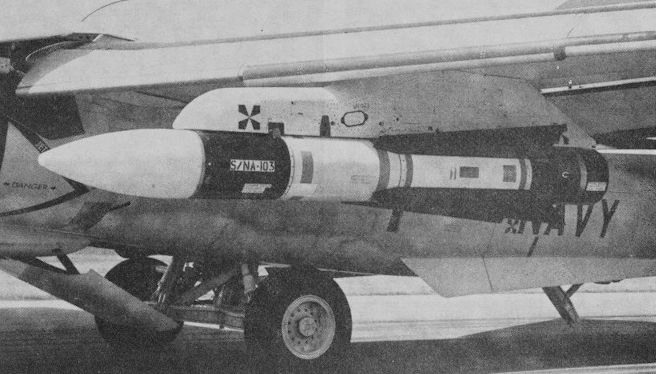 XAIM-54A Phoenix air-to-air missile used for first test with a live warhead. Launched from an F-111B, it destroyed an F9F Cougar target at extended range
