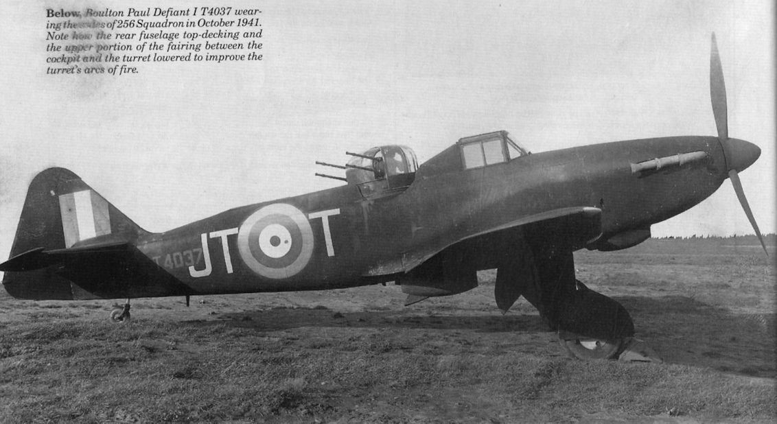Регистрационный номер: T4037 Boulton Paul Defiant I T4037 wearing the codes of 256 Squadron in October 1941. Note how the rear fuselage top-decking and the upper portion of the fairing between the cockpit and the turret lowered to improve the turret's arcs of fire.
