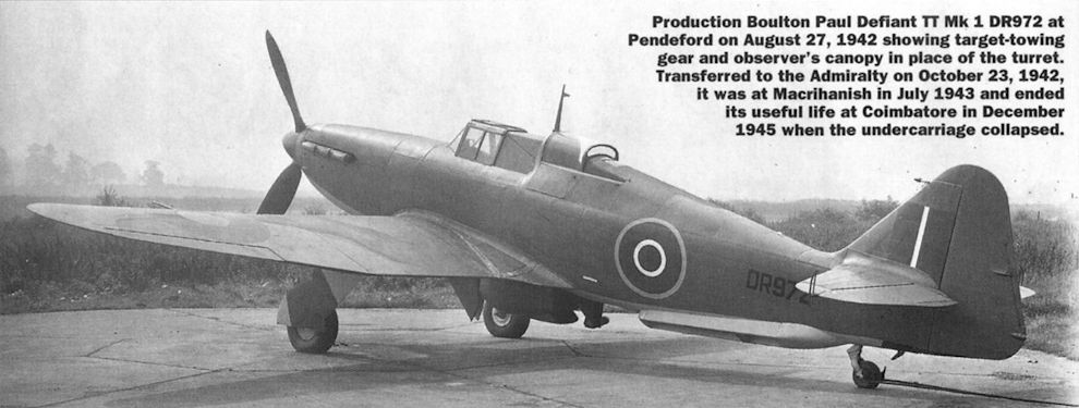Регистрационный номер: DR972 Production Boulton Paul Defiant TT Mk 1 DR972 at Pendeford on August 27, 1942 showing target-towing gear and observer’s canopy in place of the turret. Transferred to the Admiralty on October 23, 1942, it was at Macrihanish in July 1943 and ended its useful life at Coimbatore in December 1945 when the undercarriage collapsed.