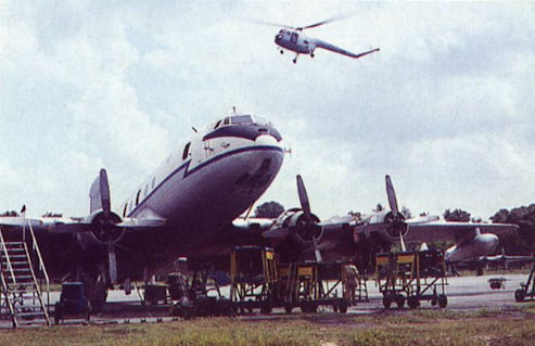 A Hastings with underwing tanks undergoing first-line maintenance at Changi, with a Sycamore helicopter about to land.