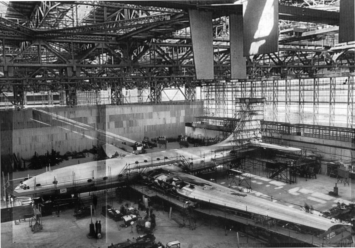 Регистрационный номер: G-AGPW [49] The Brabazon under construction in the enormous new assembly hall at Filton in January 1948. The eight Bristol Centaurus 20 sleeve-valve engines driving four six-bladed contra-rotating propellers are still to be installed.