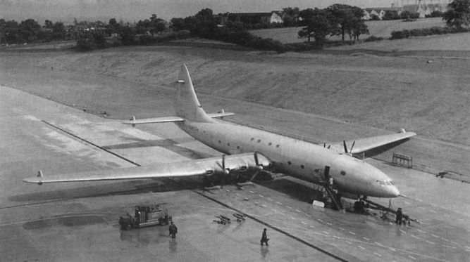 Регистрационный номер: G-AGPW [49] An unusual view of the Brabazon. The black markings on the fuselage were used to assist interpretation of photographic test records.