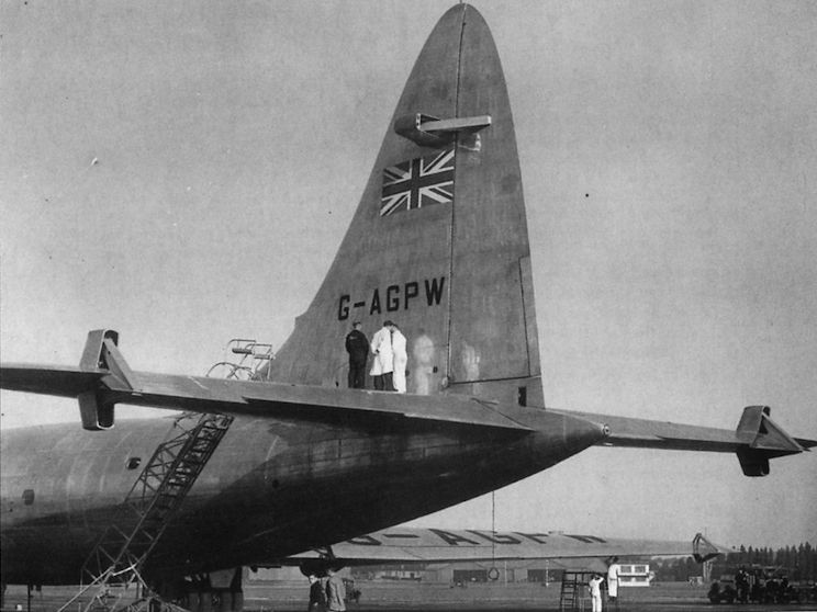 Регистрационный номер: G-AGPW [49] A Bristol mechanic inspects the tail of the Bristol Brabazon prototype, G-AGPW, the largest passenger landplane in the world, in September 1950.