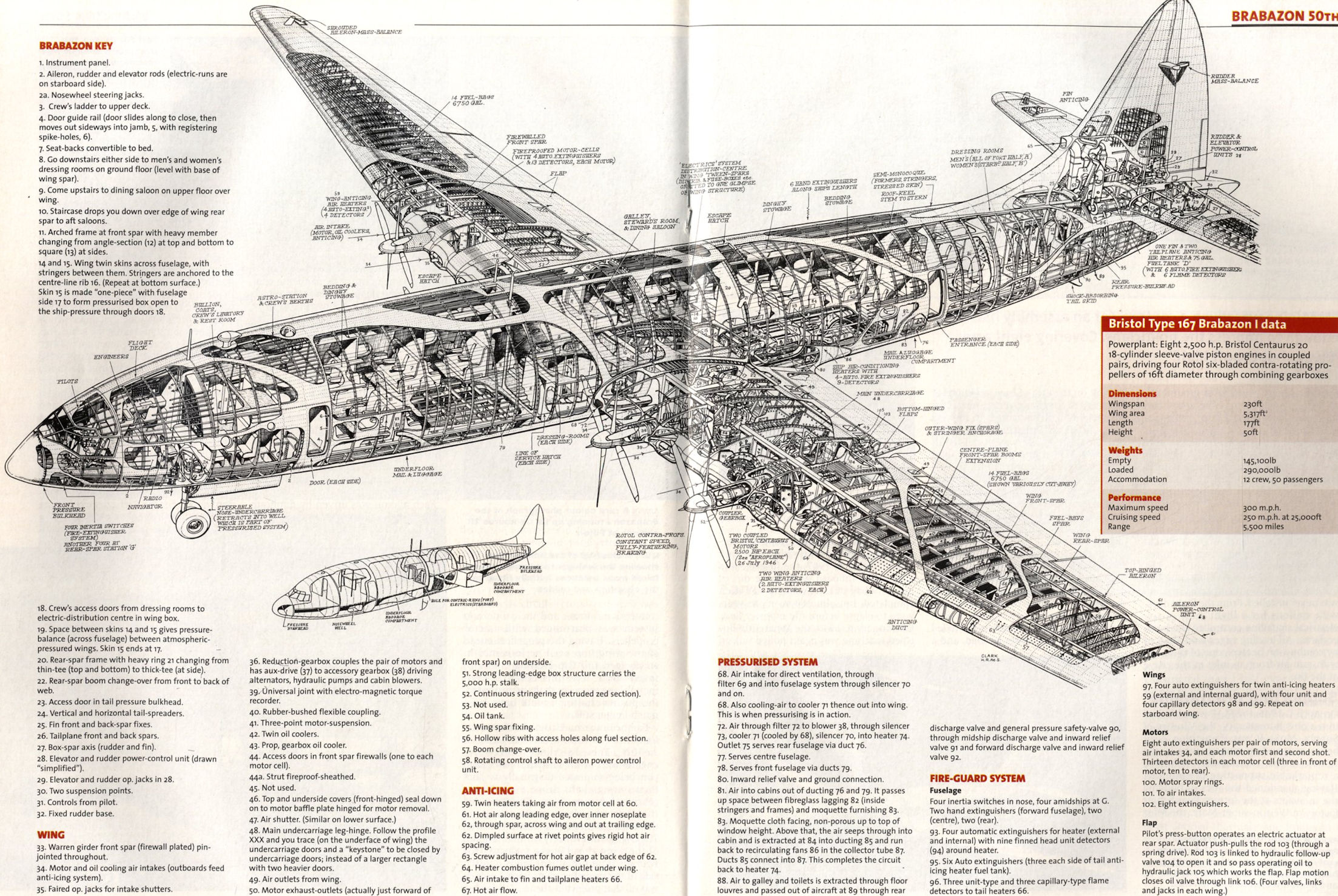 Регистрационный номер: G-AGPW [49] Brabazon - британский гигант. 4 сентября 1949г.: с аэродрома в Филтоне под управлением летчика-испытателя Э. Дж. Пега совершил первый полет самый большой самолет, построенный в Великобритании - Bristol 167 Brabazon, имевший размах крыла 70,1 м и оснащенный восемью двигателями Bristol Centaurus XX мощностью 2500 л. с. Brabazon I был первым из двух прототипов перспективного дальнемагистрального авиалайнера, планировавшегося к постройке после Второй мировой войны. Работы по контракту от 1944 года по проекту Type 167 начались в 1945 году, причем первый полет планировался в 1947 году. Работы осложнялись тем, что Brabazon II должен был оснащаться четырьмя турбовинтовыми Bristol Coupled-Proteus 710 мощностью по 7000 л.е., а также протестами со стороны общины Филтона, так как необходимость удлинить ВПП привела к разрушению населенного пункта и переносу дороги. Заказчиков на самолет не нашли, проект закрыли. Brabazon I разобрали в 1953 году, а вторую машину так и не достроили.