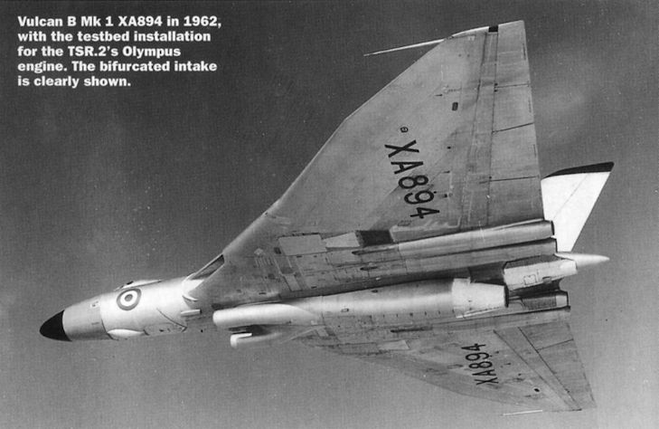 Регистрационный номер: XA894 [4] The seventh production Avro Vulcan B Mk 1, XA894, was modified and instrumented to serve as the flying testbed for the Olympus 22R, the engine proposed for the TSR.2. The test engine was installed in a ventral pod with a bifurcated air intake.